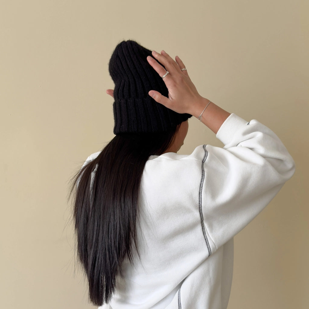 Stay cozy and frizz-free with our luxurious cashmere satin-lined beanie, designed to keep you warm while protecting your hair from damage.